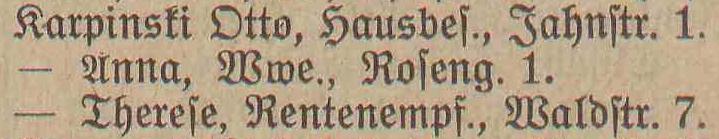 Karpinski, Therese, Rentenempf., Waldstraße 7 (Leśna 7).