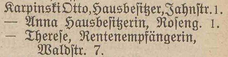 Karpinski, Otto, Hausbesitzer, Jahnstraße 1 (Liczmańskiego 1). Hausbesitzer: Bergstraße 8 (Podhalańska 8), Jahnstraße 1 (Liczmańskiego 1), Waldstrasse 8 (Leśna 8).