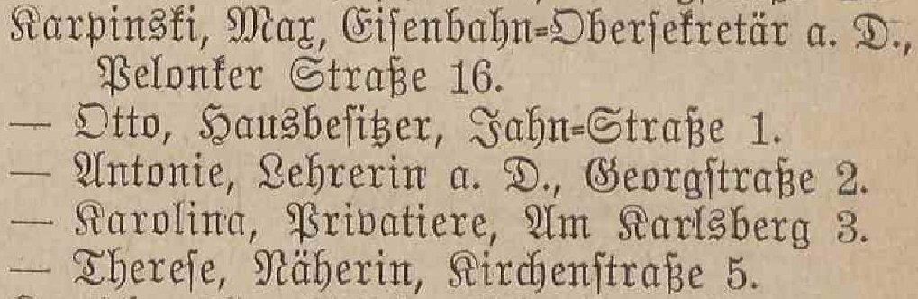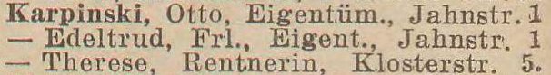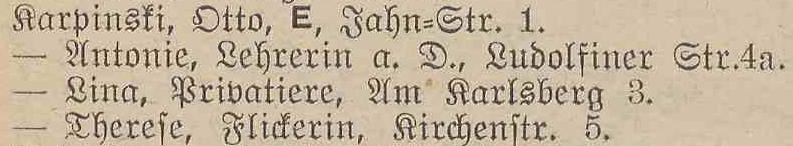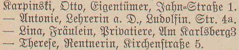 Karpinski, Lina, Fräulein, Privatiere, Am Karlsberg 3 (Opacka 5).