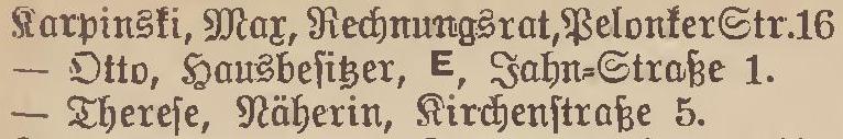 Karpinski, Therese, Rentnrn., Kirchenstraße 5 (Cystersów 5).