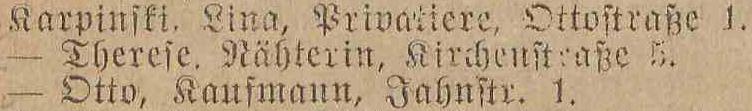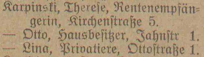 Karpinski, Lina, Rentiere, Ottostraße 1 (Słoneczna 1).