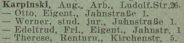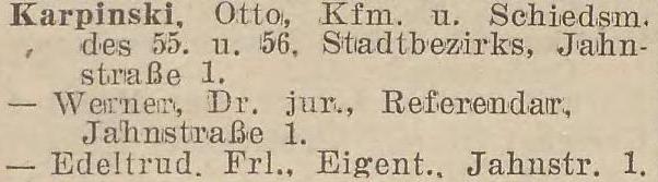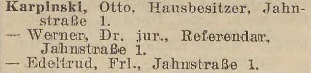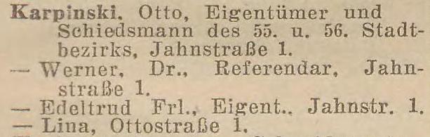 | Otto Karpinski | - 1909-1942 - | Jahnstraße 1 (Liczmańskiego 1). |