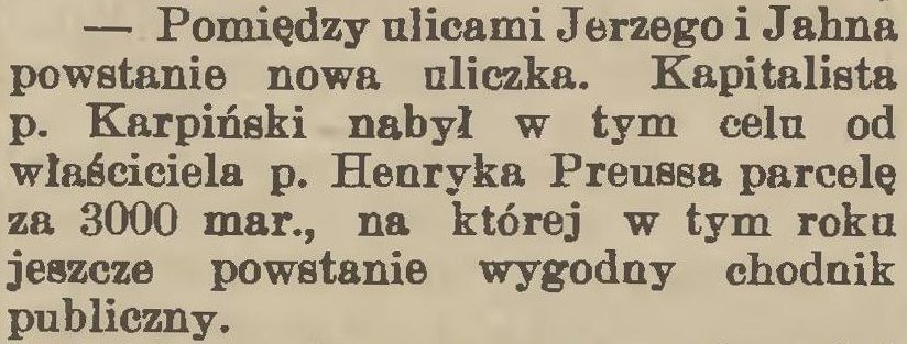 Pomiędzy ulicami Jerzego (Georgstraße) i Jahna (Jahnstraße) powstanie nowa uliczka. Kapitalista p. Karpiński nabył w tym celu od właściciela p. Henryka Preussa parcelę z 3000 mar., na której w tym roku jeszcze powstanie wygodny chodnik publiczny. Gazeta Gdańska nr 118 z 2. 10. 1909.