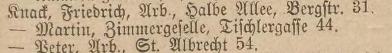 Martin Knaak, Zimmermstr., Am Kaisersteg 2/3 (Piastowska 2/3). Mieszka przy Zimmererstraße 30 (Droszyñskiego). 1926.