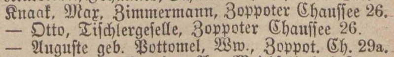 Max Knaak, Zimmermann, Zopoter Chaussee 26 (Grunwaldzka 594).