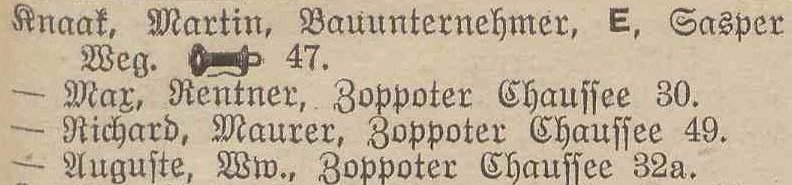 Richard Knaak, Maurer, Zopoter Chaussee 49 (Grunwaldzka 579).