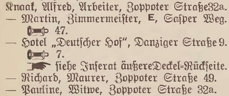 Martin Knaak, Hotelbesitzer, Bahnhofstraaße 10 (Grunwaldzka 505). Tel. 12. Wohnung: Zimmererstraße 30 (Droszyñskiego). Tel. 47.
