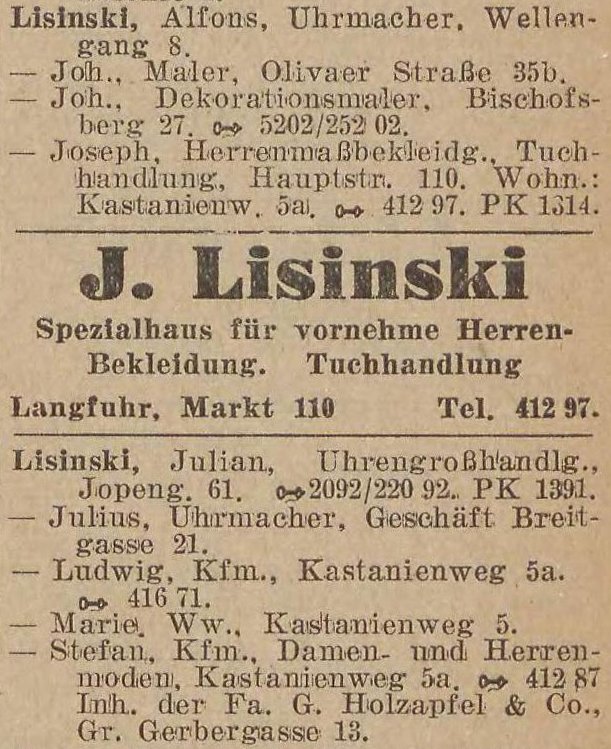 Julian Lisinski, Uhrengroßhändler, Pelonken Straße 69, Fa. Danzig, Jopengasse 61.
