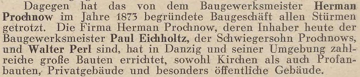 Natomiast firma budowlana założona w 1873 roku przez mistrza budowlanego Hermana Prochnowa oparła się wszelkim burzom. Firma Herman Prochnow, której właścicielami są dziś mistrz budowlany Paul Eichholtz, zięć Prochnowa i Walter Perl, wybudowała na terenie Gdańska i okolic wiele dużych obiektów budowlanych, zarówno kościołów, jak i budynków świeckich, budynków prywatnych, a zwłaszcza budynków użyteczności publicznej.