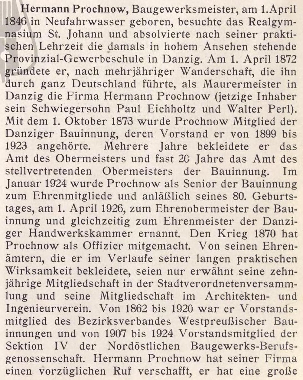 Hermann Prochnow, mistrz budowlany, urodzony 1 kwietnia 1846 r. w Neufahrwasser, uczęszczał do Realgymnasium St. Johann i po odbyciu praktyki zawodowej ukończył cieszącą się wówczas dużym uznaniem prowincjonalną szkołę handlową w Gdańsku. 1 kwietnia 1872 roku, po kilku latach tułaczki po Niemczech, jako mistrz murarski założył w Gdańsku firmę Hermann Prochnow (obecnymi właścicielami są jego zięć Paul Eichholtz i Walter Perl). 1 października 1873 roku Prochnow został członkiem gdańskiego cechu budowlanego, którego członkiem był od 1899 do 1923 roku. Przez kilka lat pełnił funkcję nadsztygara, a przez prawie 20 lat funkcję zastępcy nadsztygara cechu budowlanego. W styczniu 1924 roku Prochnow został mianowany honorowym członkiem cechu budowlanego jako starszy, a z okazji swoich 80. Gdańskiej Izby Rzemieślniczej. Prochnow brał udział w wojnie 1870 jako oficer. Z funkcji honorowych, jakie pełnił w ciągu swojej wieloletniej działalności praktycznej, należy wspomnieć tylko o jego dziesięcioletnim członkostwie w radzie miejskiej i członkostwie w Stowarzyszeniu Architektów i Inżynierów. Od 1862 do 1920 był członkiem zarządu okręgowego związku zachodniopruskich cechów budowlanych, a od 1907 do 1924 członkiem zarządu Oddziału IV północno-wschodniego związku branżowego budownictwa. Hermann Prochnow dał swojej firmie znakomitą reputację, wykonał wiele najważniejszych budowli w Gdańsku, Królewcu, Elblągu, Malborku i wielu innych miejscowościach województw wschodnich w budownictwie inżynieryjnym. Zmarł w połowie 1927 roku.