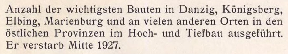 Hermann Prochnow, Baugewerksmeister, am 1.April 1846 in Neufahrwasser geboren, besuchte das Realgym- nasium St. Johann und absolvierte nach seiner prakti- schen Lehrzeit die damals in hohem Ansehen stehende Provinzial-Gewerbeschule in Danzig. Am 1. April 1872 gründete er, nach mehrjähriger Wanderschaft, die ihn durch ganz Deutschland führte, als Maurermeister in Danzig die Firma Hermann Prochnow (jetzige Inhaber sein Schwiegersohn Paul Eichholtz und Walter Perl). Mit dem 1. Oktober 1873 wurde Prochnow Mitglied der Danziger Bauinnung, deren Vorstand er von 1899 bis 1923 angehörte. Mehrere Jahre bekleidete er das Amt des Obermeisters und fast 20 Jahre das Amt des stellvertretenden Obermeisters der Bauinnung. Im Januar 1924 wurde Prochnow als Senior der Bauinnung zum Ehrenmitgliede und anläßlich seines 80. Geburts- tages, am 1. April 1926, zum Ehrenobermeister der Bau- innung und gleichzeitig zum Ehrenmeister der Danzi- ger Handwerkskammer ernannt. Den Krieg 1870 hat Prochnow als Offizier mitgemacht. Von seinen Ehren- ämtern, die er im Verlaufe seiner langen praktischen Wirksamkeit bekleidete, seien nur erwähnt seine zehn- jährige Mitgliedschaft in der Stadtverordnetenversamm- lung und seine Mitgliedschaft im Architekten- und Ingenieurverein. Von 1862 bis 1920 war er Vorstands- mitglied des Bezirksverbandes Westpreußischer Bau- innungen und von 1907 bis 1924 Vorstandsmitglied der Sektion IV der Nordöstlichen Baugewerks-Berufs- genossenschaft. Hermann Prochnow hat seiner Firma einen vorzüglichen Ruf verschafft, er hat eine große Anzahl der wichtigsten Bauten in Danzig, Königsberg, Elbing, Marienburg und an vielen anderen Orten in den östlichen Provinzen im Hoch- und Tiefbau ausgeführt. Er verstarb Mitte 1927.