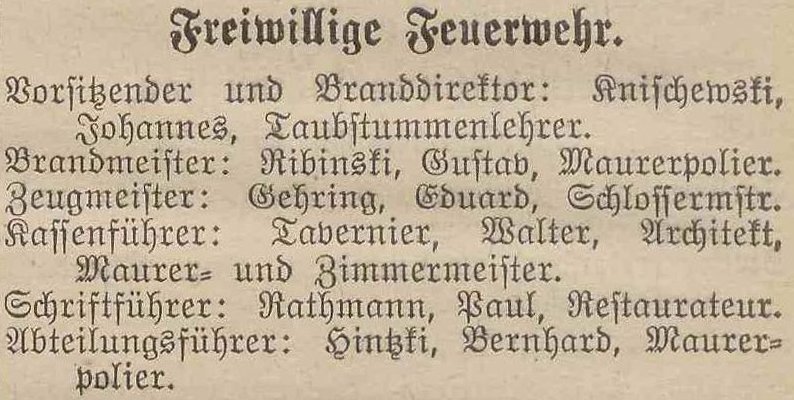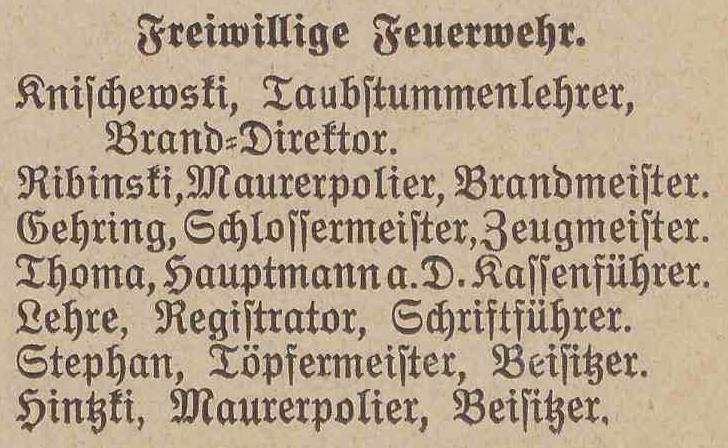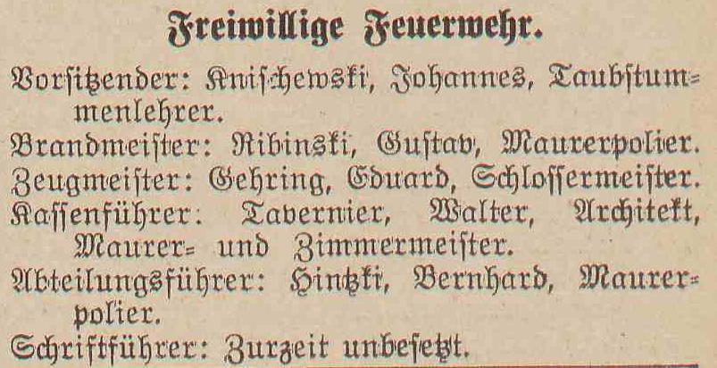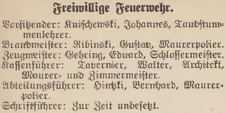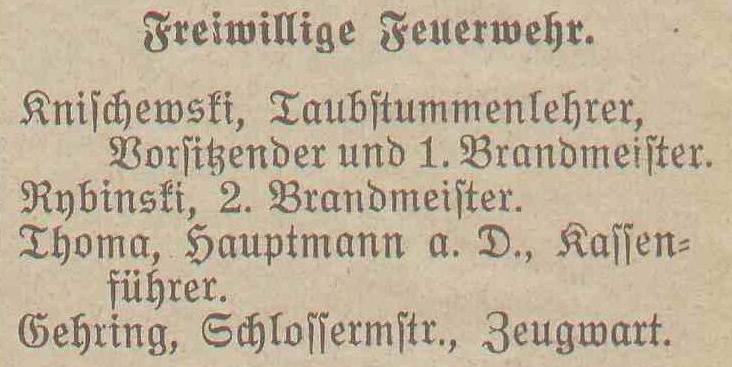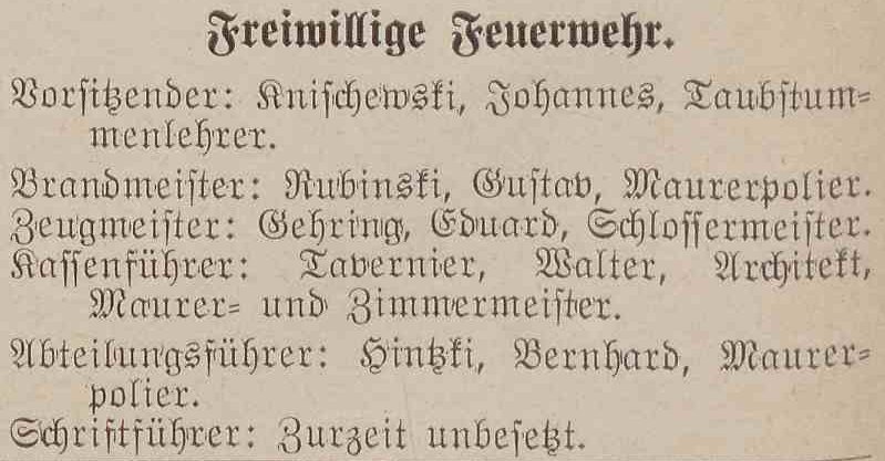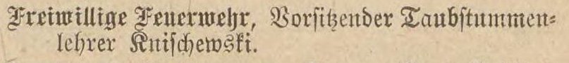 Freiwillige Feuerwehr, Vorsitzender Taubstummenlehrer Knischewski (Kirchenstraße 3).