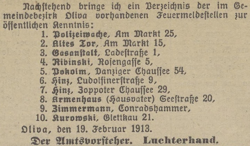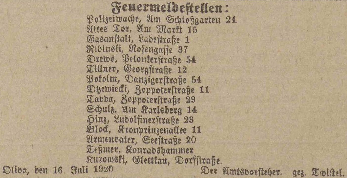 Oliva, den 16. Juli 1920. Der Amtsvorsteher. gez. Twistel.