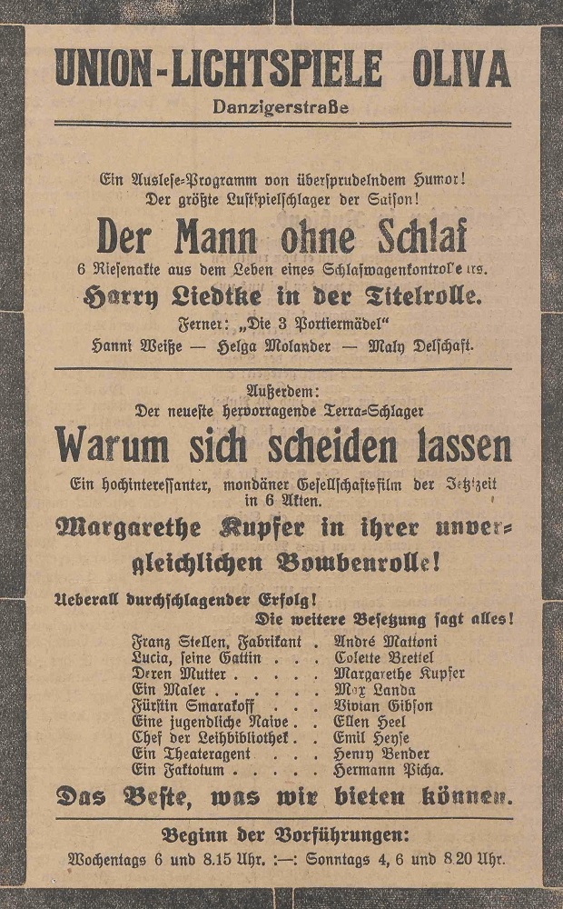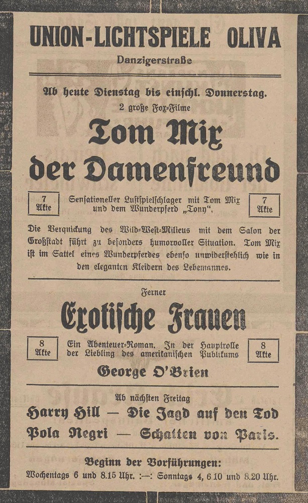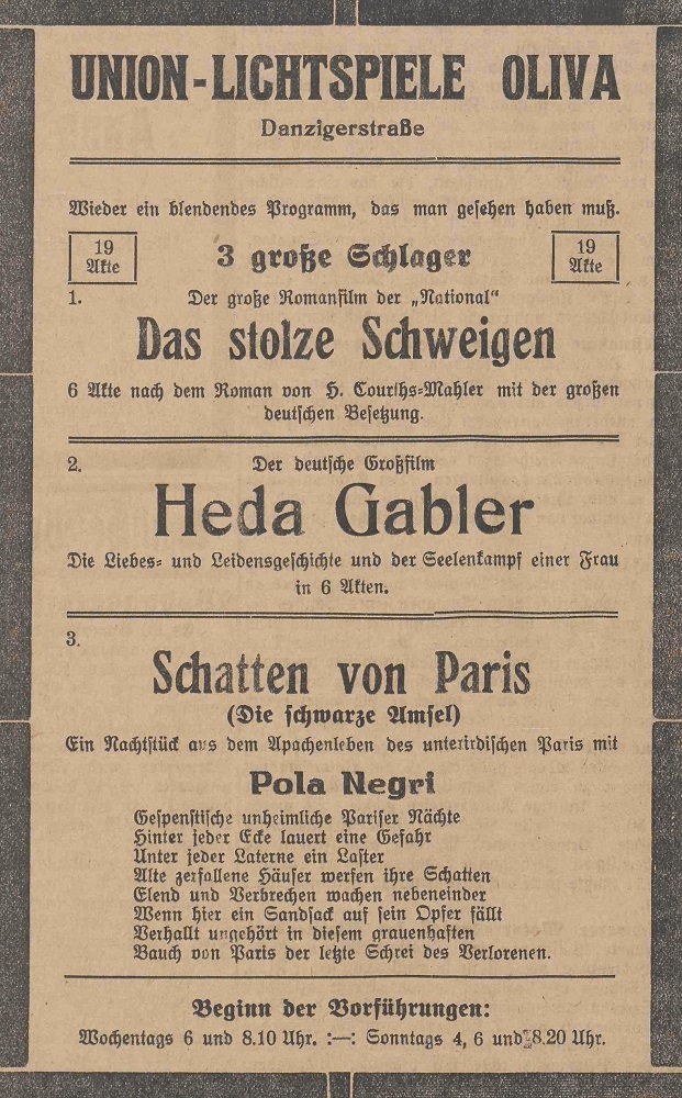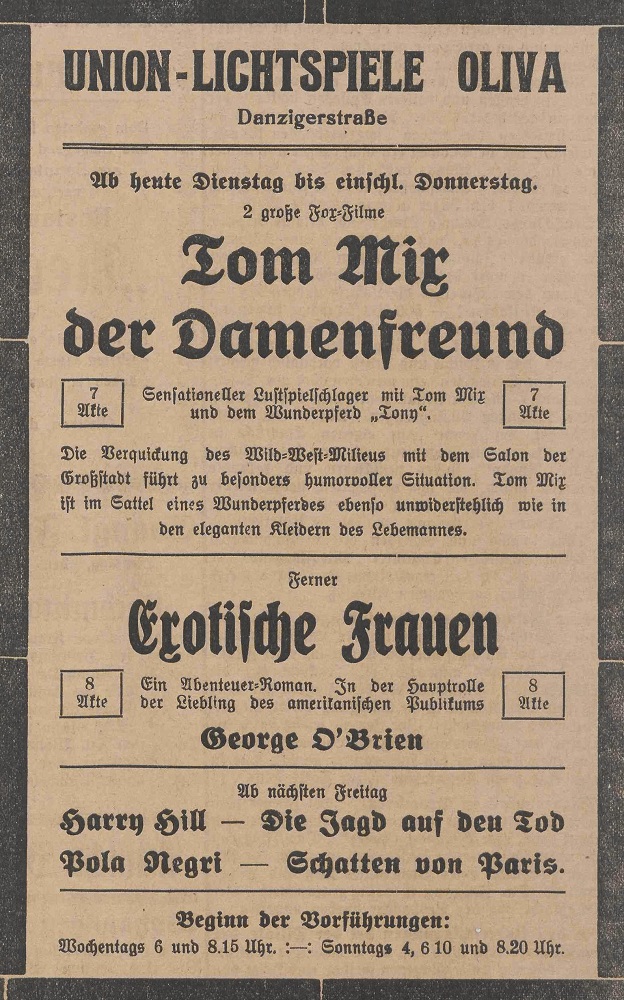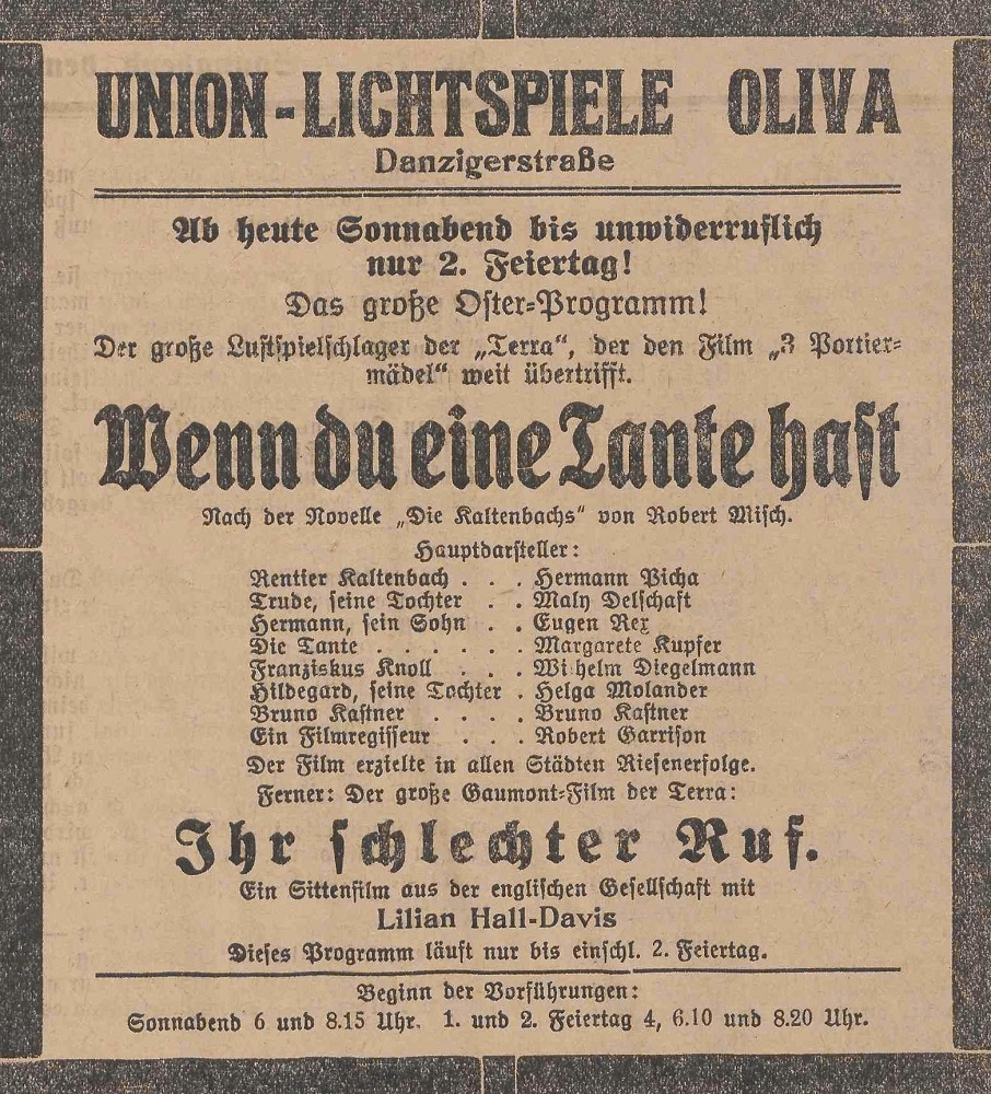 Lichtspielhaus Oliva - Am Schloßgarten 11 Union-Lichtspiele Oliva - Danziger Straße 2 Danziger General - Anzeiger mit der "Olivaer Zeitung" nr 77 z 01. 04. 1926 r.