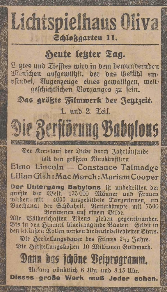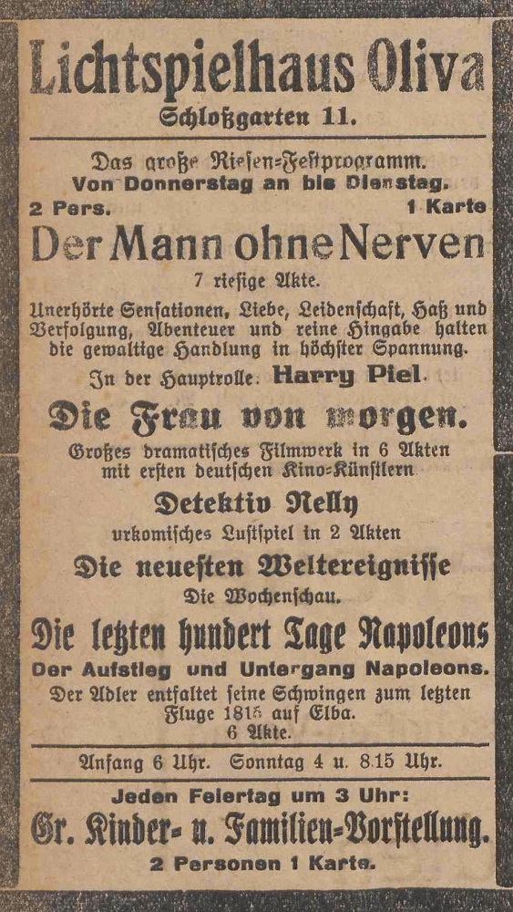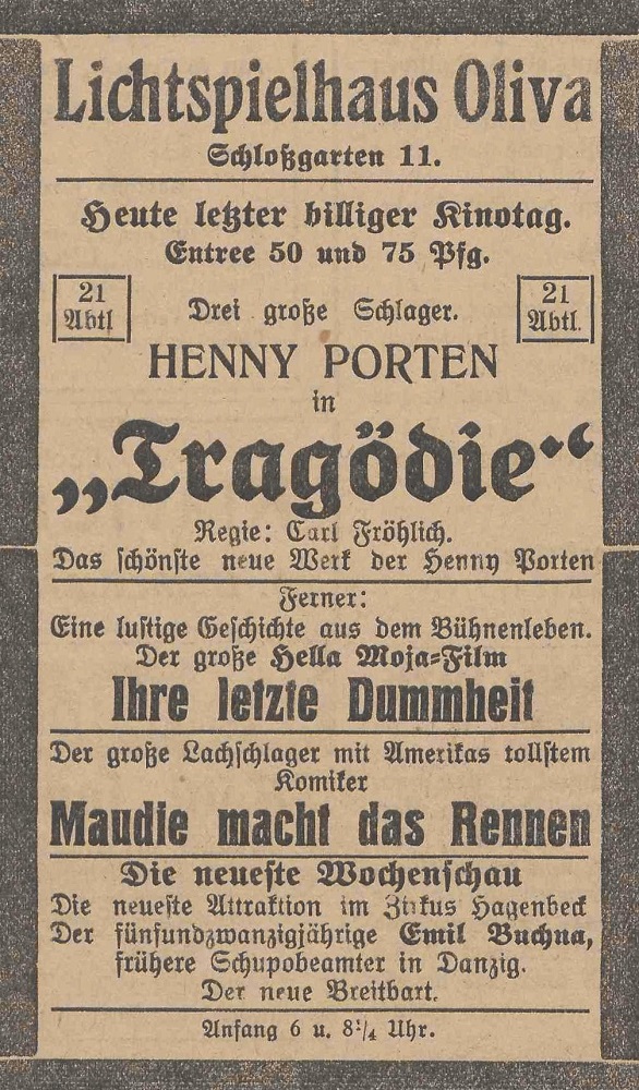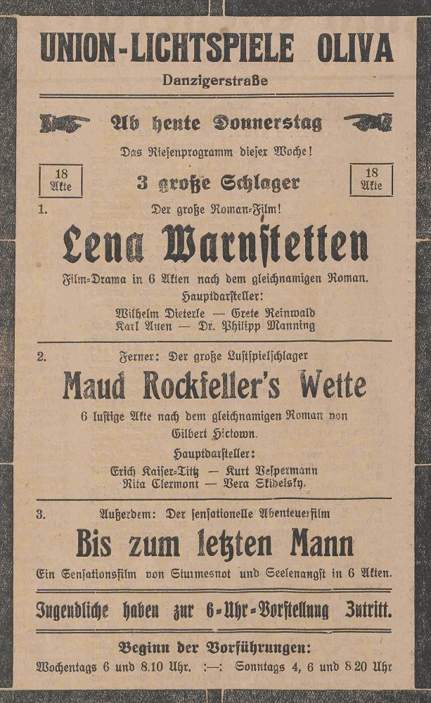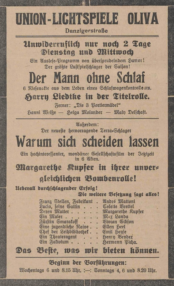 Lichtspielhaus Oliva - Am Schloßgarten 11 Union-Lichtspiele Oliva - Danziger Straße 2 Danziger General - Anzeiger mit der "Olivaer Zeitung" nr 77 z 01. 04. 1926 r.