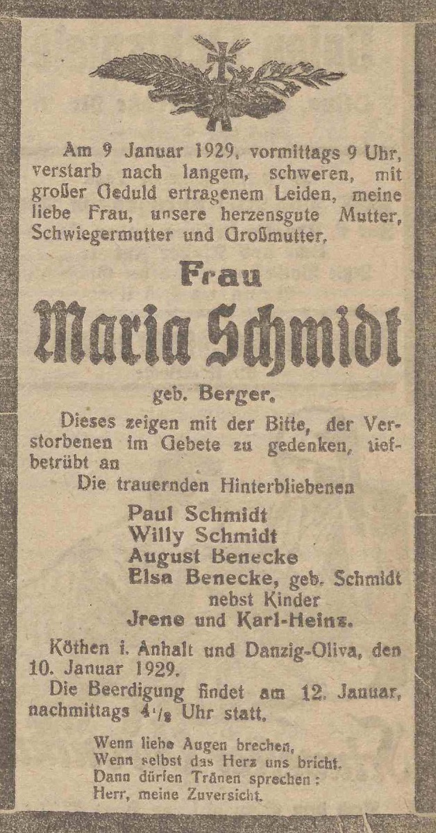 Maria Schmidt zd. Berger. Paul Schmidt. Willy Schmidt. August, Elsa Benecke zd. Schmidt. Olivaer Zeintung nr 9 z 11. 01. 1929 r.