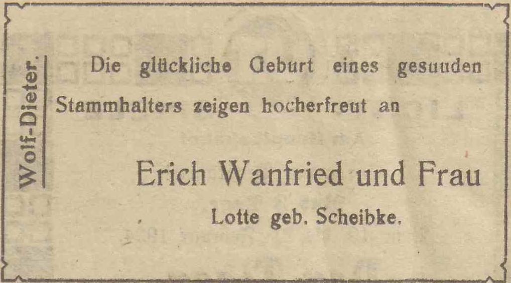 Narodziny dziecka. Lotte Wanfried zd. Scheibke. Erich Wanfried. Olivaer Zeintung nr 44 z 21. 02. 1924 r.