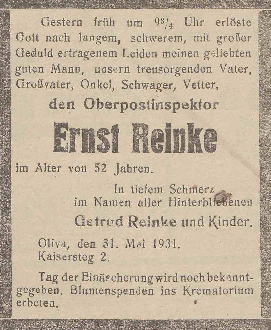 Ernst Reinke. Gertrud Reinke.. Danzig-Olivaer Zeintung nr 125 z 01. 06. 1931 r.