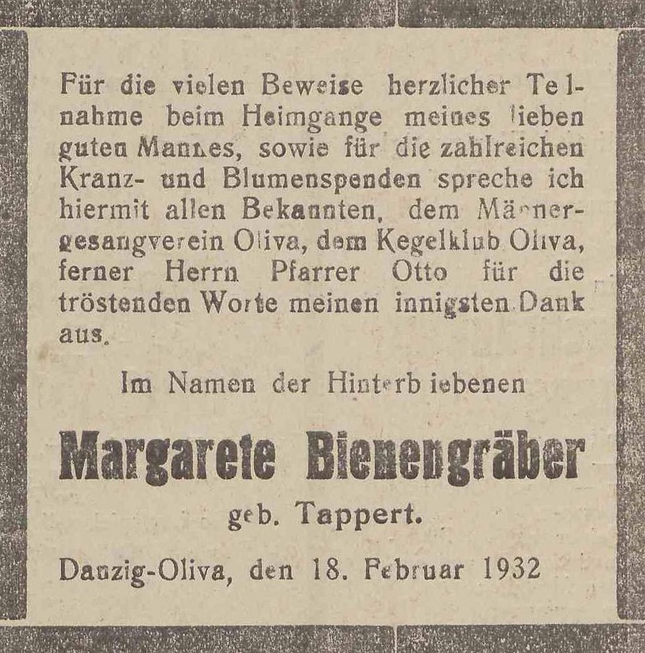 Margarete Bienengräber zd. Tappert. Danzig-Olivaer Zeintung nr 41 z 18. 02. 1932 r.