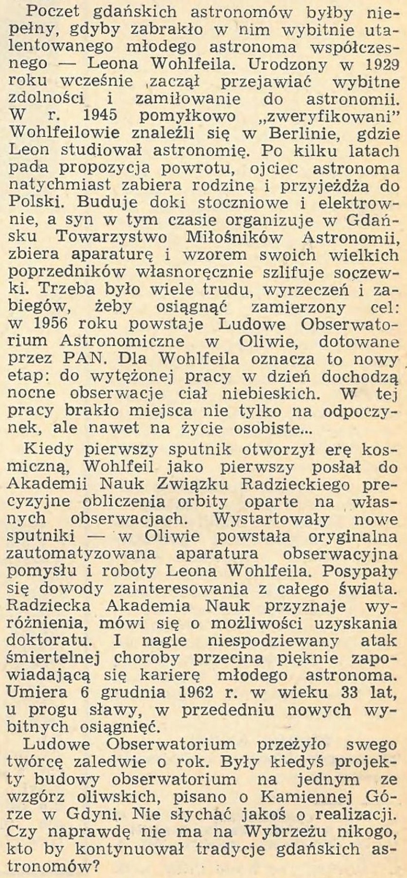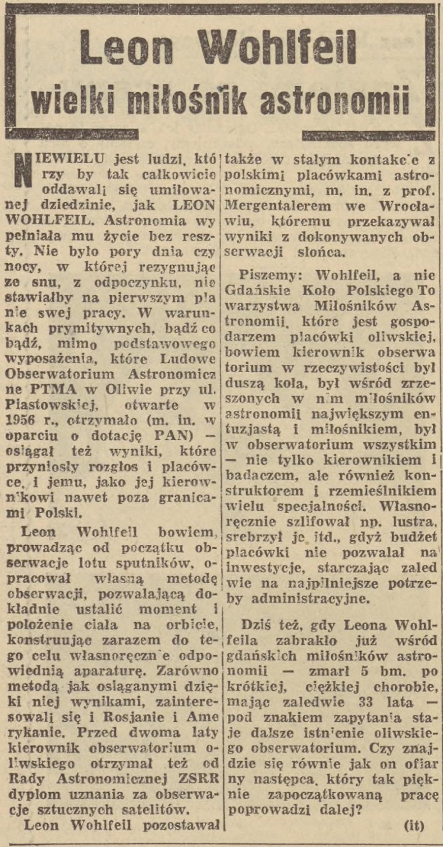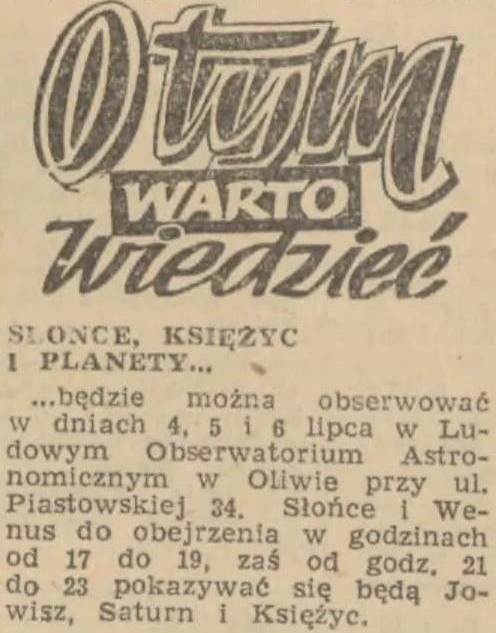 W tym ogłoszeniu poinformowano o uruchomieniu Ludowego Obserwatorium Astronomicznego w Oliwie, które mieściło się w budynku przy ulicy Piastowskiej 34. LOA było prowadzone przez lokalne koło Polskiego Towarzystwa Miłośników Astronomii.