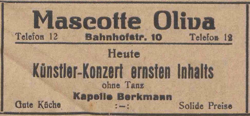 Mascotte Oliva, Bahnhofstraße 10. Anzeiger mit der "Olivaer Zeitung", nr 77 z 04. 01. 1926.