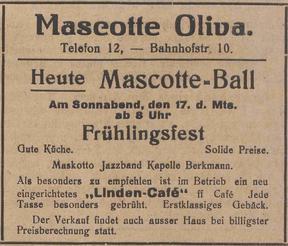 Mascotte Oliva. Poleca nowo otwart¹?: Linden Café. Anzeiger mit der "Olivaer Zeitung", nr 87 z 15. 04. 1926.