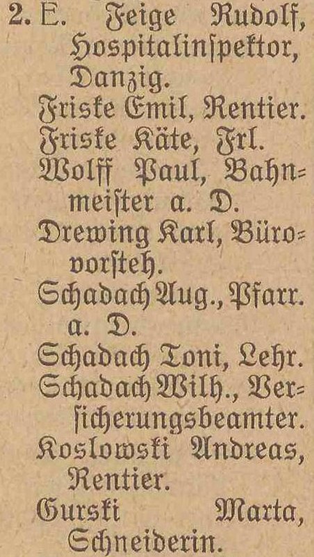 Ziche (10 osób), Friske (3 sosoby), Roslowski (1 osobę) i Schadach (1 osobę).