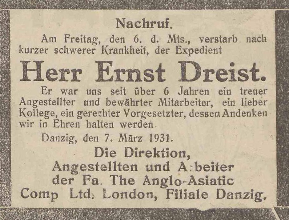 Ernst Dreist. Danzig-Olivaer Zeintung nr 56 z 07. 03. 1931 r.