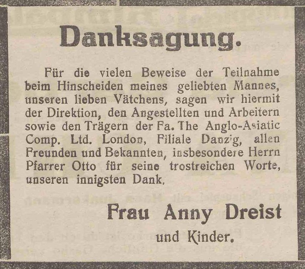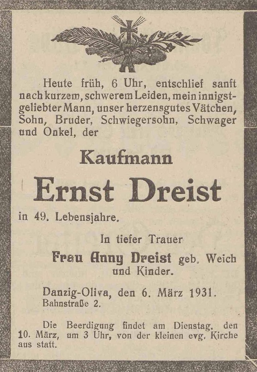 Ernst Dreist. Anny Dreist zd. Weich. Danzig-Olivaer Zeintung nr 56 z 07. 03. 1931 r.
