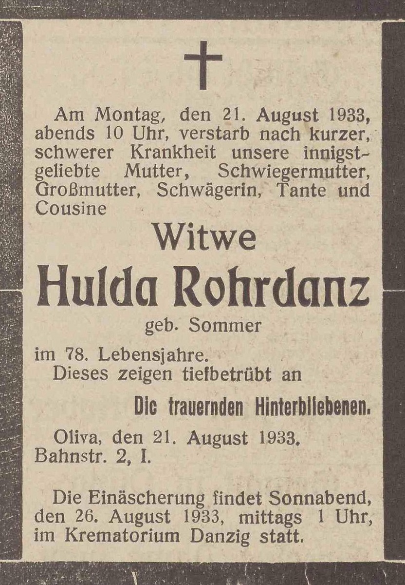 Wdowa Hulda Rohrdanz zd. Sommer. Danzig-Olivaer Zeintung nr 197 z 23. 08. 1933 r.