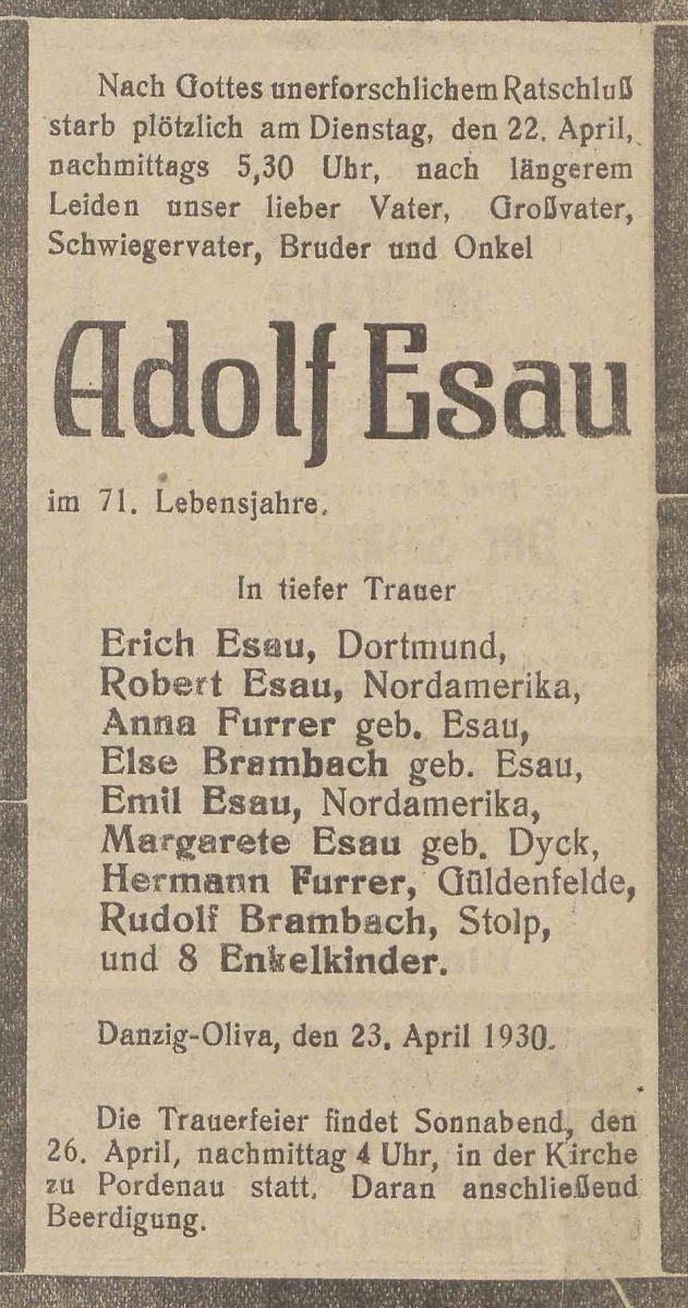 Adolf Esau. Erch Esau. Robert Esau. Hermann, Anna Furrer zd. Esau. Rudolf, Else Brambach zd. Esau. Emil Esau. Pochowany w Pordenowie (pomorskie). Olivaer Zeintung nr 94 z 23. 04. 1930 r.