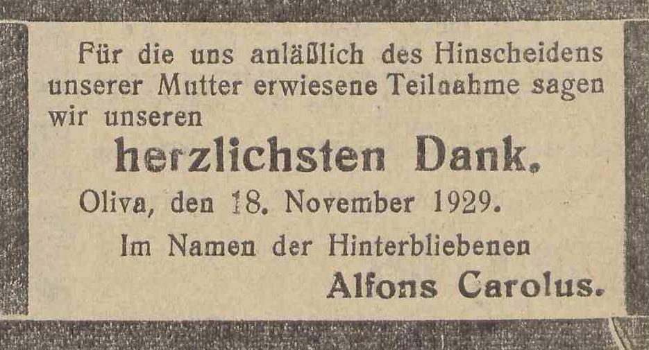 Klara Carolus. Alfons Carolus. Olivaer Zeintung nr 272 z 19. 11. 1929 r.