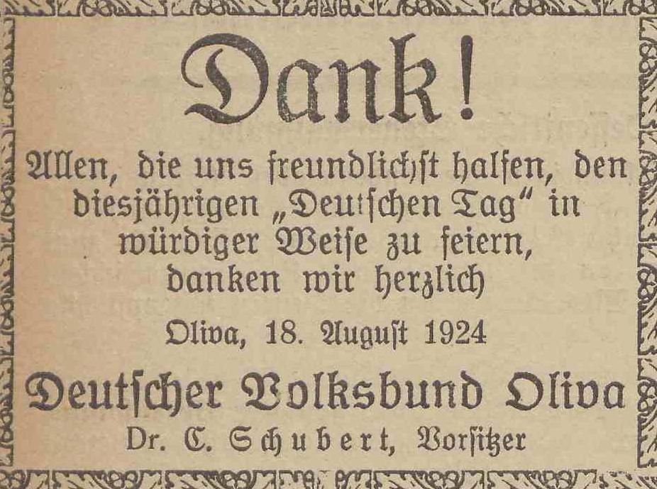 Dr. Carl Schubert. Olivaer Zeintung nr 193 z 19. 08. 1924 r.