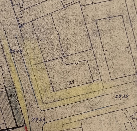 Planu Gdańska z 1933 roku. Zaznaczono dom nr 1 przy ul. Pelonker Straße / 21 przy Georgstraße. Z kolekcji Bibioteki Uniwersytetu Chicago.