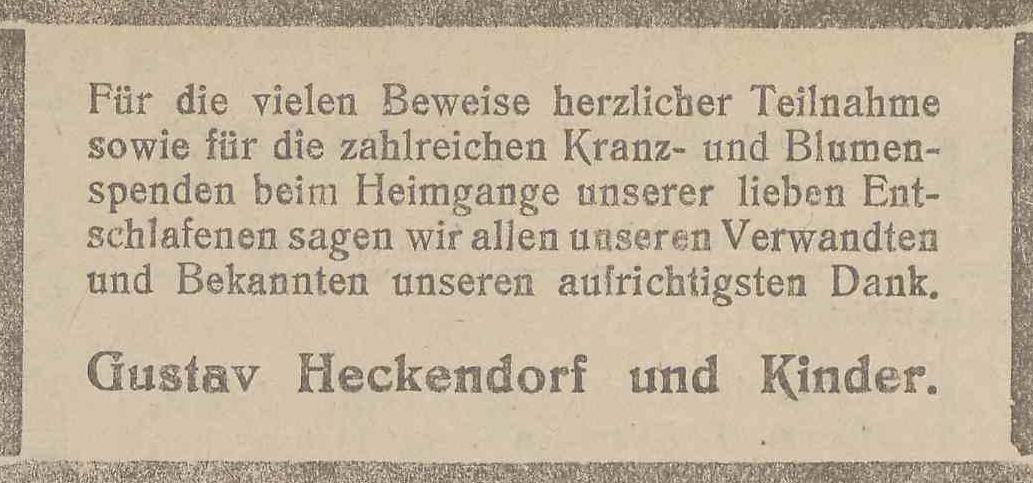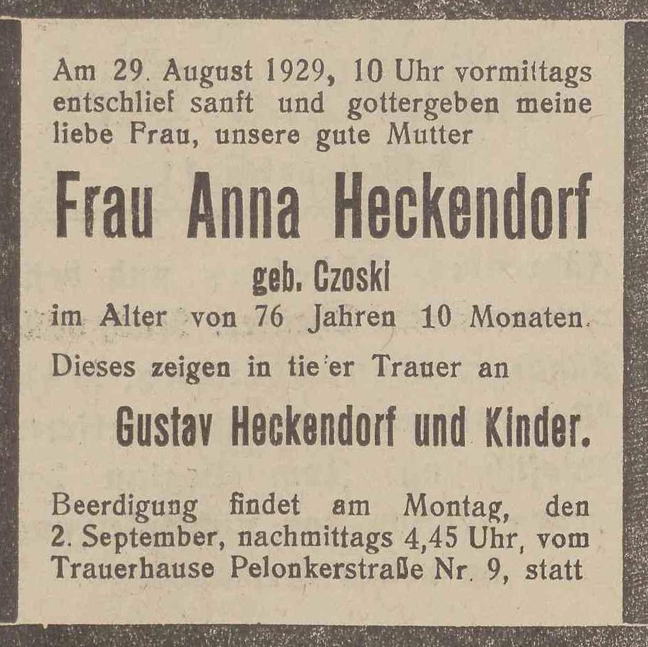 Anna Heckendorf zd. Czoski. Gustav Heckendorf. Olivaer Zeintung nr 203 z 30. 08. 1929 r.