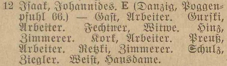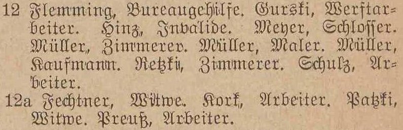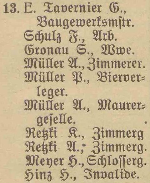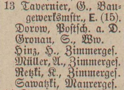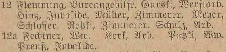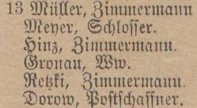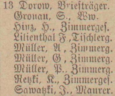 Blank, August, Töpfer. Dorow, Johann, Postichaffner. Gronau, S., geb Piaschinski, Ww. Hinz, Heinrich, Zimmermann. Müller, August, Zimmermann. Retzki, Carl, Zimmermann. Sawatzki, Josef, Maurer.