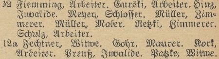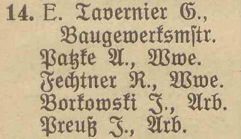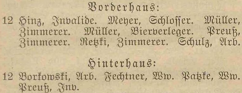 Borkowski, Johann, Arb. Fechtner, Eduard, Seemann. Patzki, Anna, geb. Träder, Ww. Preuß, Johann, Arb.