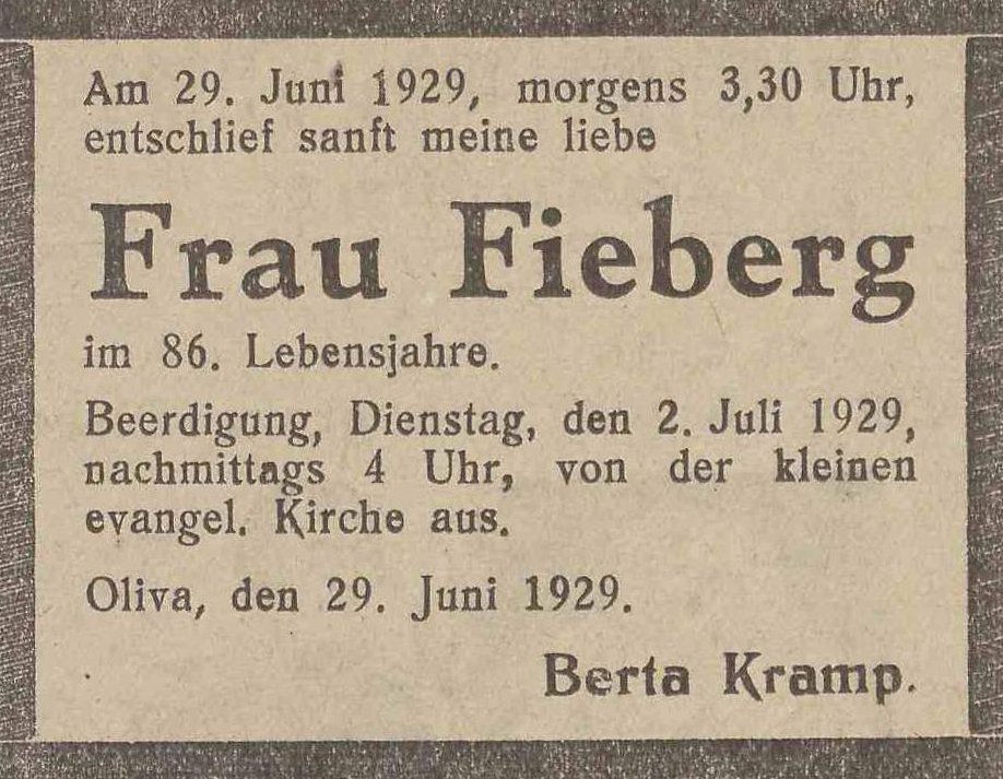 Magdalene Fieberg. Berta Kramp. Olivaer Zeintung nr 151 z 01. 07. 1929 r.