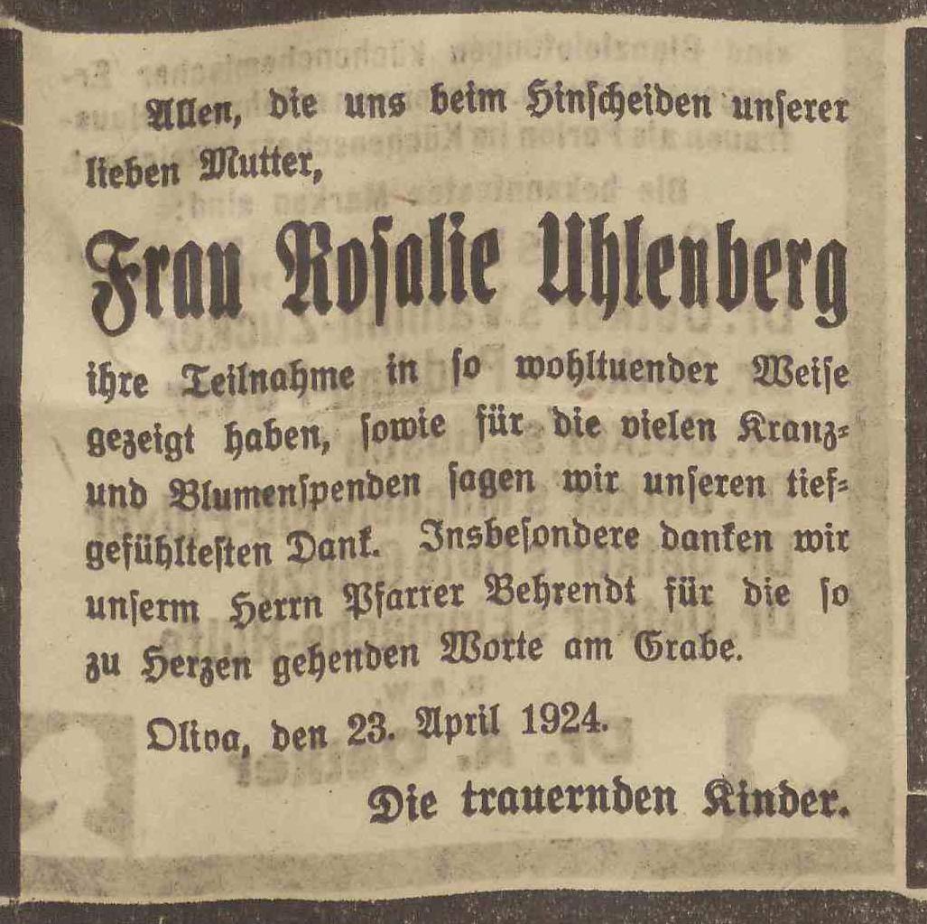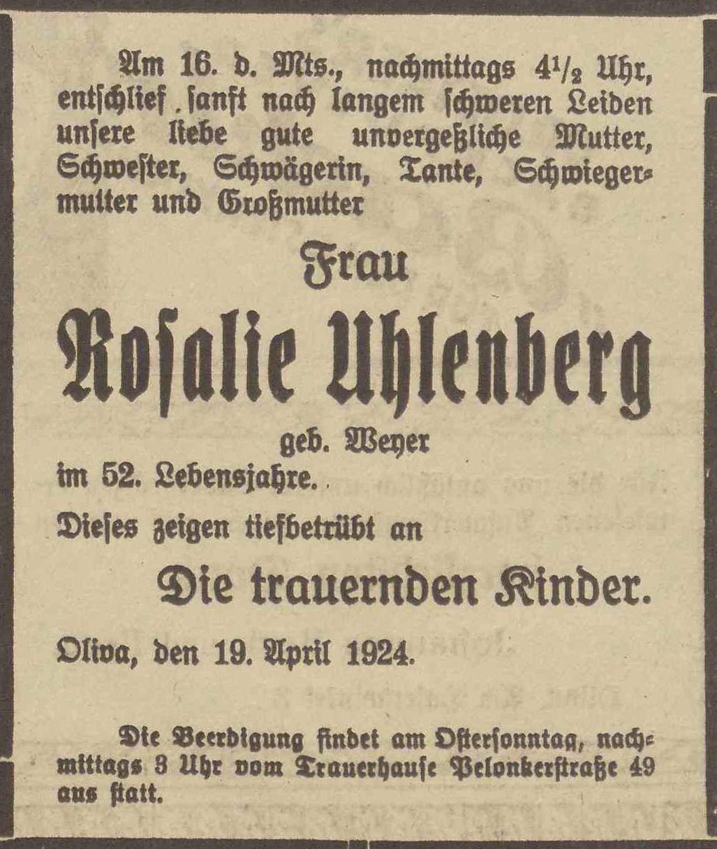 Rosalie Ahlenberg zd. Weyer. Olivaer Zeintung nr 93 z 19. 04. 1924 r.