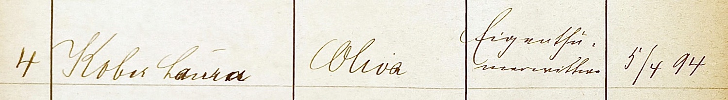 Laura Kober. Baukonholle Oliva IXX. Wpis z 05. 04. 1894. Przekazała Grażyna Niemyjska.