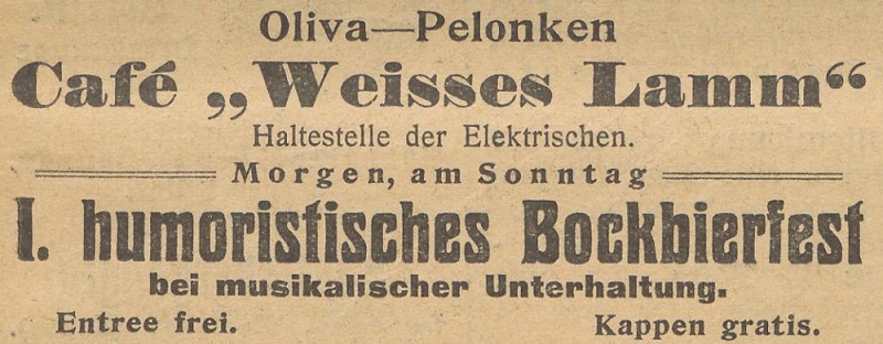Püttner Elise, "", Danzig 1904, str. 39: An der Pelonker Straße, gegenüber dem „Fünften Hof", ist das Restaurant „Weißes Lamm" zu nennen.