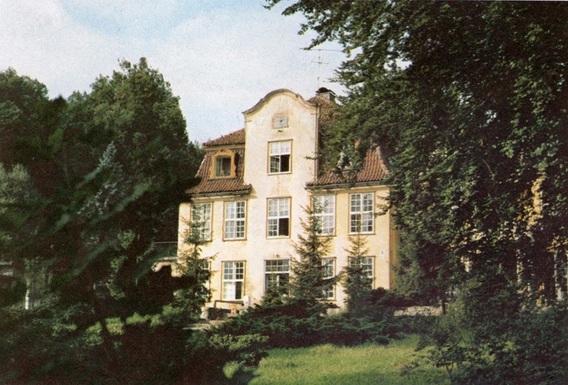 Wschodnie fasady Dworu V. Budynek południowy (po lewej) pochodzi z 2 poł. XVIII wieku, północny z początku XIX wieku. Fot. Artur Wołosewicz 1977. Przekazał Robert Krygier.