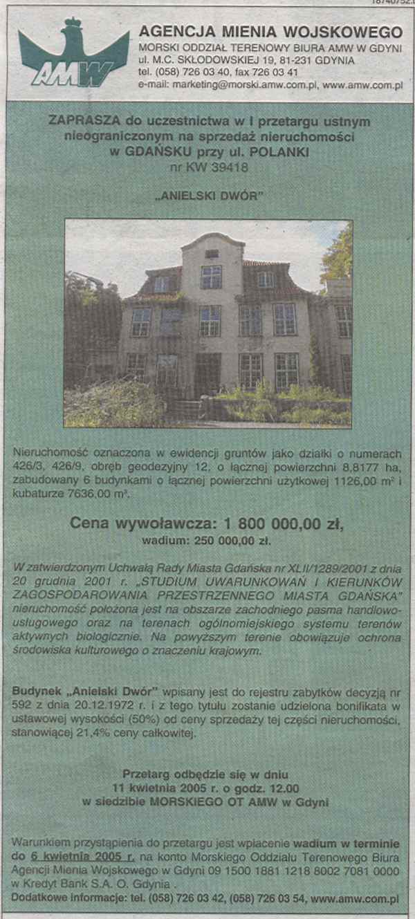 Oferta sprzedaży Anielskiego Dworu z 2005 roku. Ze strony Forum.DawnyGdansk.pl (Mikołaj).