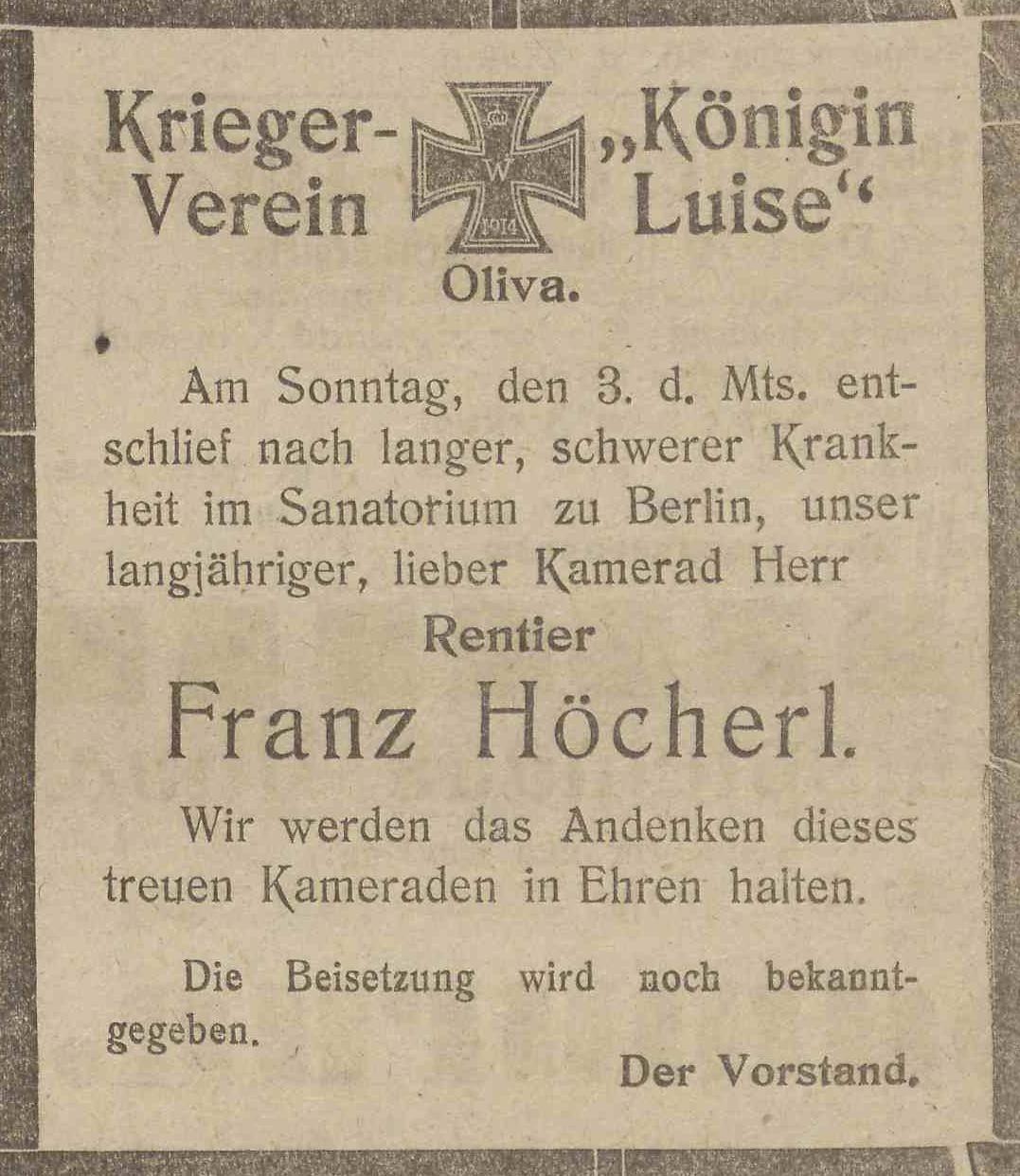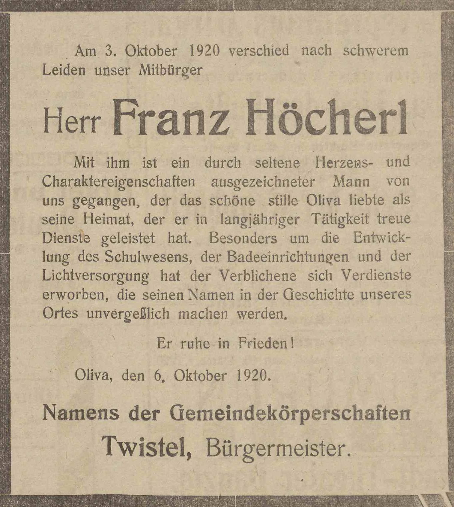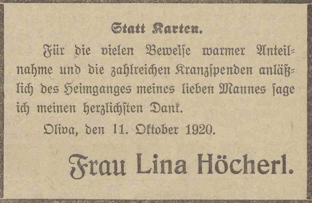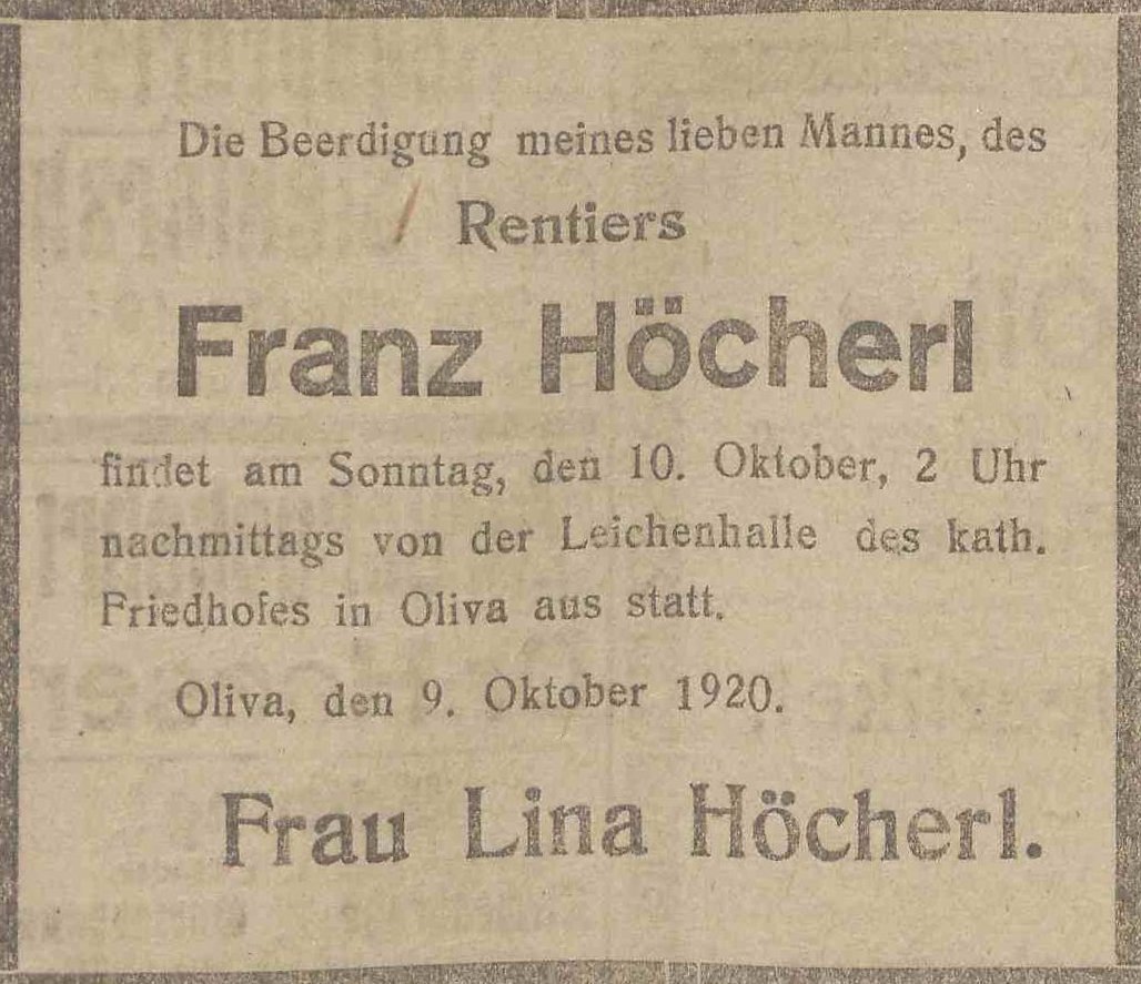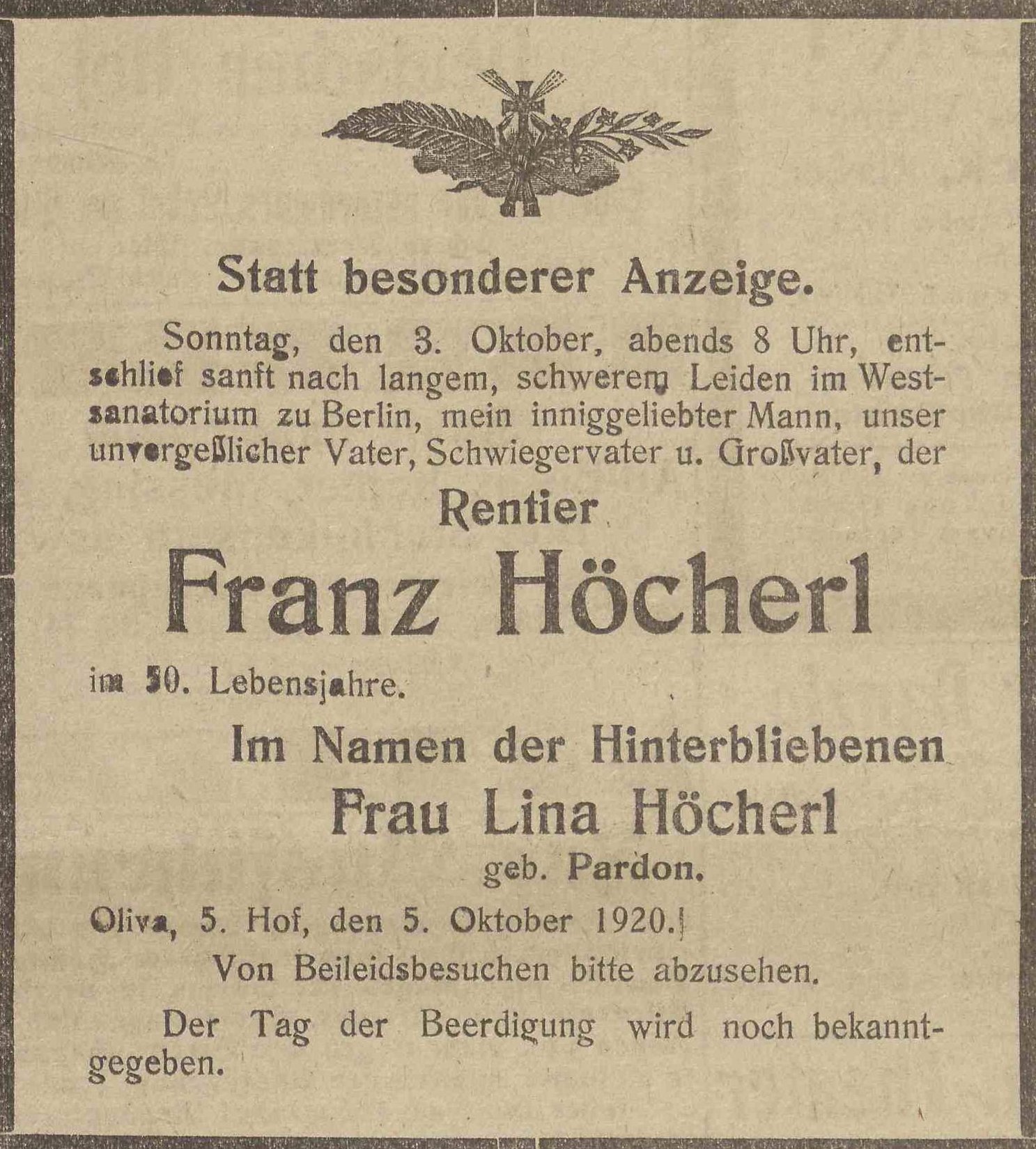 Franz Höcherl (ur. 1870, zm. 1920). Lina Höcherl z domu Pardon. Olivaer Zeintung nr 233 z 05. 10. 1920 r.