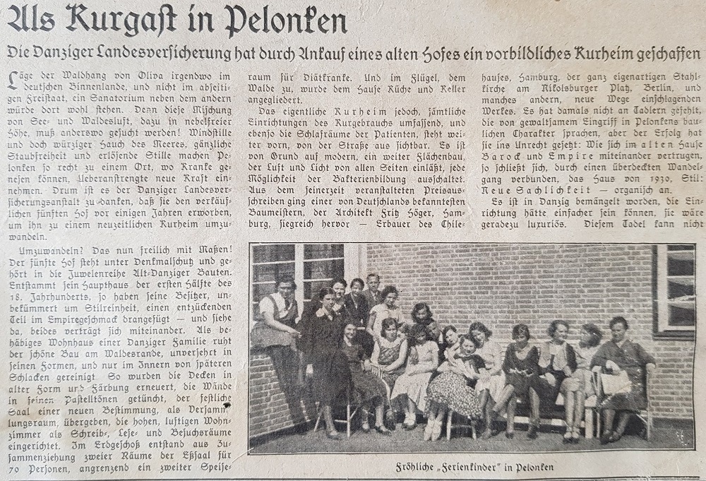 Gdyby zalesione zbocza Oliwy znajdowały się gdzieś w Niemczech a nie w Wolnym Mieście Gdańsku, prawdopodobnie stało by tam jedno sanatorium obok drugiego. Takiej mieszanki morskiego i leśnego powietrza bez mgieł nie można znaleźć nigdzie indziej! Morze, pełna wolność od kurzu i zbawienna cisza sprawiają, że uzdrowisko na polankach jest miejscem, w którym chorzy mogą wyzdrowieć i nabrać nowych sił. Dlatego gdańska ubezpieczalnia społeczna jest wdzięczna, że kilka lat temu mogła nabyć piąty dwór, aby uczynić go nowoczesnym uzdrowiskiem. Przebudowa? Oczywiście, ale z umiarem! Piąty dwór jest budynkiem zabytkowym i należy do serii najpiękniejszych dawnych gdańskich budowli. Jego główny budynek jest z pierwszej połowy XVIII wieku. Dawni właściciele nie troszcząc się o czystość stylu zmieniali go i przebudowywali wielokrotnie. Piękny budynek, na przełomie wieków własność wielu gdańskich rodzin, spoczywa na skraju lasu w swej formie nieco zaburzony,