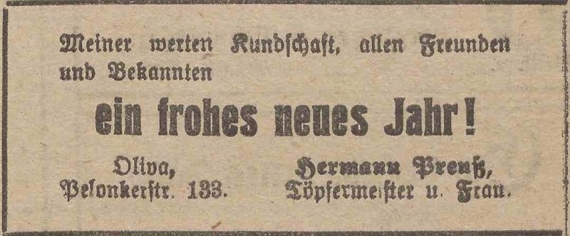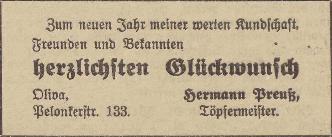 Hermann Preuß, Topfermeister. Podziękowania noworoczne, Olivaer Zeitung nr 305 z 31. 12. 1924.