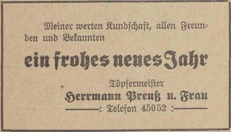 Hermann Preuß, Topfermeister. Podziękowania noworoczne, Olivaer Zeitung nr 305 z 31. 12. 1931.