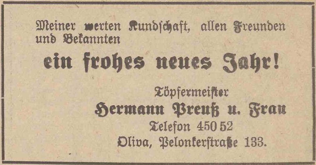 Hermann Preuß, Topfermeister. Podziękowania noworoczne, Olivaer Zeitung nr 305 z 31. 12. 1929.