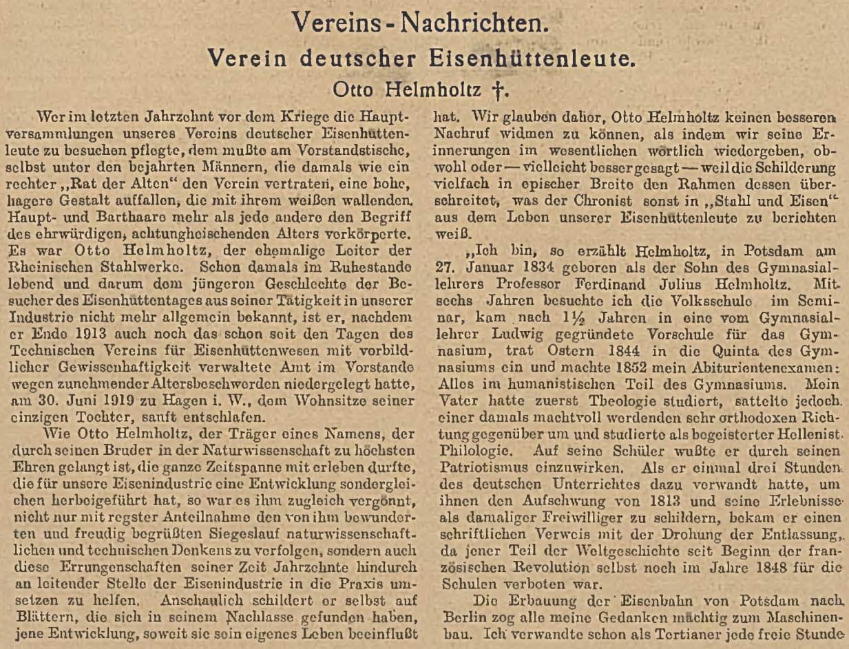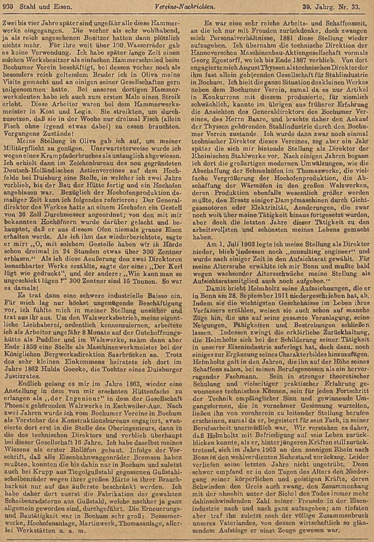 Zwei bis vior Jahre spätersind ungefähr alle diese Hammerwerko oingogangen. Die vorher als schr wohlhabend, ja als reich angesehenen Bositzor hatten dann plötzlich nichts mehr. Für ihro woit übor 190. Wasgerrädor gab os keine Vorwendung. Ich habo später lango Zoit oinen solchen Worksbositzer als oinfachon Hammerschmied boin Boohumor Veroin beschäftigt, boi dessen vorher noch als besonders roich geltendom Brudor ich in Oliva moino Visito gomacht und an oinigon soiner Gesollschafton gern toilgenommen hatto. Bei unsoron dortigon Hammorwerksleuten habe ich auch zum ersten Malo einen Stroik orlobt. Diese Arboitor Waren boi dom Hammerwerksmoistor in Kost und Logis. Sie stroikten, um durchzusotzen, daß sio in der Woche nur droimal Fisch (alloin Fisch ohne irgend etwas dabei) zu csson brauchton. Vergangeno Zustände!