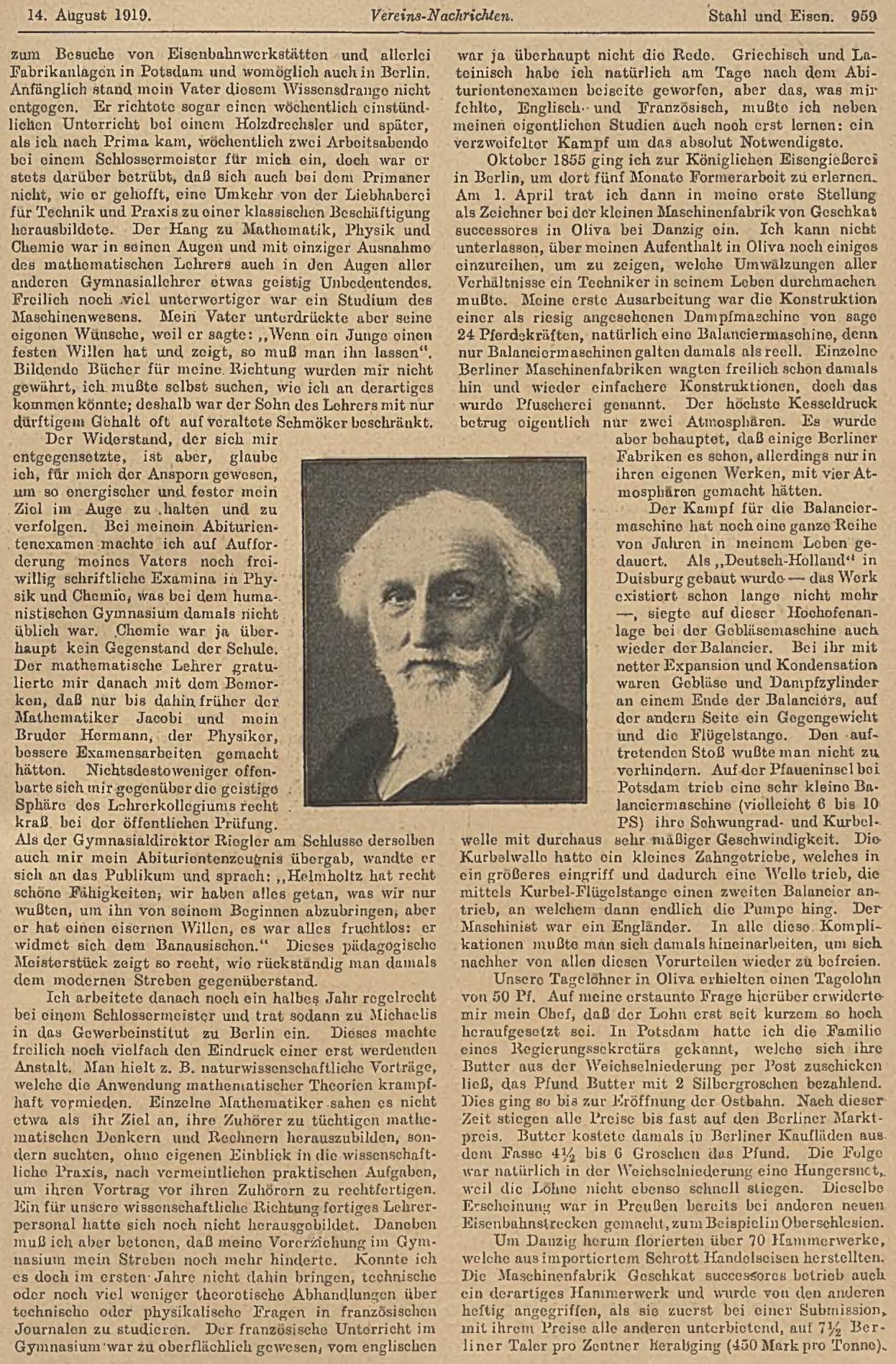 Oktober 1855 ging ich zur Königlichen Eisengießerci in Berlin, um dort fünf Monate Formerarbeit zu erlernen. Am 1. April trat ich dann in meine erste Stellung als Zeichner bei der kleinen Maschinenfabrik von Geschkat successores in Oliva bei Danzig ein. Ich kann nicht unterlagson, über meinen Aufentlialt in Oliva noch einiges cinzureihen, um zu zcigen, welche Umwalzungen aller Verhältnisse ein Techniker in seinem Leben durchmachen mußte. Meine erste Ausarbeitung war die Konstruktion einer als riesig angeschenen Dampfmaschine von sage 24 Pferdekräften, natürlich eine Balanciermaschine, denn nur Balanciermaschinen galten damals als reell. Einzelne Berliner Maschinenfabriken wagten freilich schon damals hin und wieder einfachere Konstruktionen, doch das wurde Pluscherei genannt. Der höchste Kesscldruck betrug cigentlich nur zwei Atmospharen. Es wurde aber behauptet, daß einige Berliner Fabriken es schon, allerdings nur in ihren cigenen Werken, mit vier Atmosphären gemacht hätten.